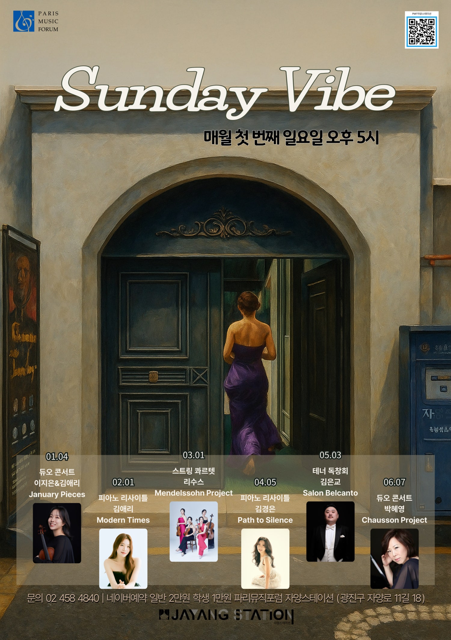 [공연소개] 안녕하세요 자양스테이션입니다. 2026년 새해부터 시작되는 자양스테이션의 새로운 기획 공연 <Sunday Vibe>를 소개드립니다. 선데이 바이브는 매월 첫번째 일요일 오후 5시에 자양동 골목에서 펼쳐지는 음악회입니다. 상반기 라인업 1/4 <January Pieces>듀오 콘서트, 이지은&김애리 2/1 <Modern Times> 피아노 리사이틀, 김애리 3/1 <Mendelssohn Project> 스트링 콰르텟, 리수스 4/5 <Path to Silence> 피아노 리사이틀, 김경은 5/3 <김은교 독창회> 테너, 김은교 6/7 <Chausson Project>듀오 콘서트, 박혜영 프로그램이 준비 되어있으며 많은 관심 부탁드립니다. 관객과 연주자가 가장 가까운 공연장, 파리뮤직포럼 자양스테이션에서 음악과 가까워지는 시간이 되시길 바라며 자양동에서 기다리고있겠습니다