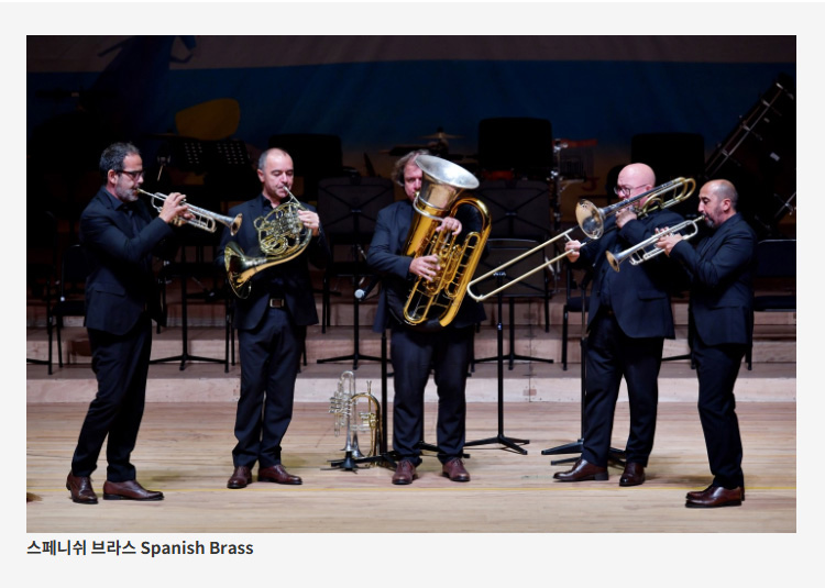 [프로그램] Jordi Griso - Circus 호르디 그리소 – 서커스 George Bizet (arr. Thierry Caens) - Carmen Miniature 조르주 비제 (티에리 캉 편곡) – 카르멘 미니어처 Charles Chaplin (arr. Thierry Caens) - Chaplin Suite 찰리 채플린 (티에리 캉 편곡) – 채플린 모음곡 Gerónimo Giménez (arr. Francisco Zacarés) - La boda de Luis Alonso 헤로니모 히메네스 (프란시스코 사카레스 편곡) – 루이스 알론소의 결혼식 - Intermission - Isaac Albéniz(arr. Maxi Santos) - Asturias(de la Suite Española) 이사크 알베니스 (막시 산토스 편곡) – 아스투리아스(모음곡 「스페인」 중에서) Manuel de Falla(arr. Carlos Benetó) - Nana 마누엘 데 파야 (카를로스 베네토 편곡) – 나나 Manuel de Falla(Arr. Pascual Llorens) - Farruca(El Sombrero de Tres Picos) 마누엘 데 파야 (파스쿠알 요렌스 편곡) – 파루카(발레 「삼각모자」 중에서) Emile Carrara(arr. Thierry Thibault) - Mon Amant de Saint Jean 에밀 카레라 (티에리 티보 편곡) – 생장 거리의 연인 Astor Piazzolla(arr. Thierry Caens) - Oblivion 아스토르 피아졸라 (티에리 캉 편곡) – 오블리비온 Astor Piazzolla(arr. Thierry Caens) - Libertango 아스토르 피아졸라 (티에리 캉 편곡) – 리베르탱고 Adam Rappa - Bulería pa Spanish Brass 아담 라파 – 스페니쉬 브라스를 위한 불레리아 본 공연의 프로그램은 연주자의 사정에 의해 사전 공지 없이 변경될 수 있습니다.