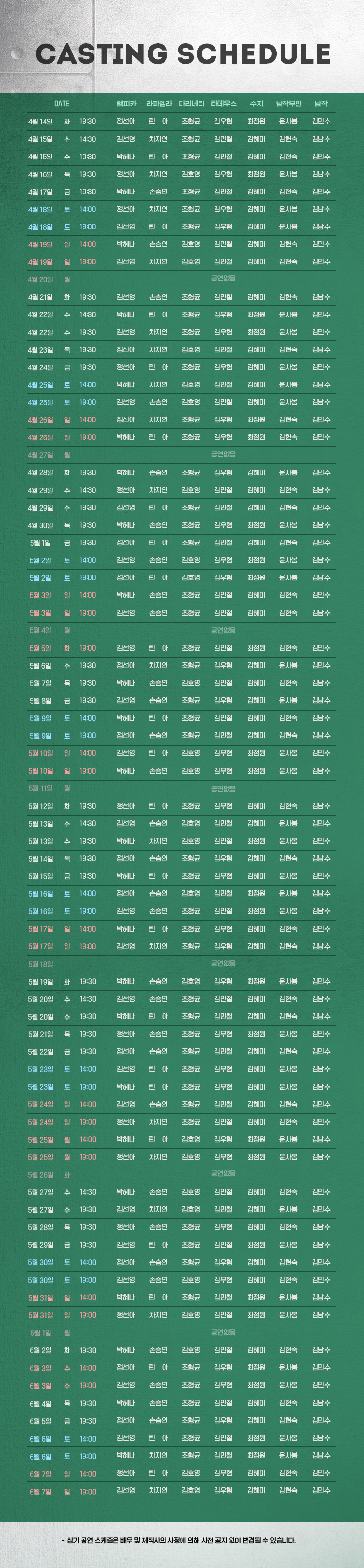화요일(19:30), 수요일(14:30,19:30), 목요일 ~ 금요일(19:30), 토요일 ~ 일요일(14:00,19:00), HOL(14:00,19:00)
