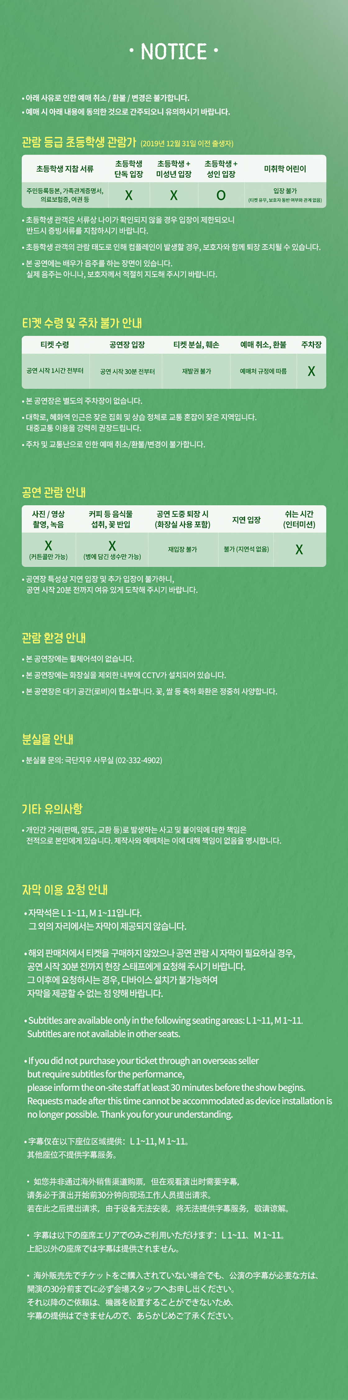 수요일 ~ 금요일(19:30), 토요일(14:00,17:00), 일요일(14:00)